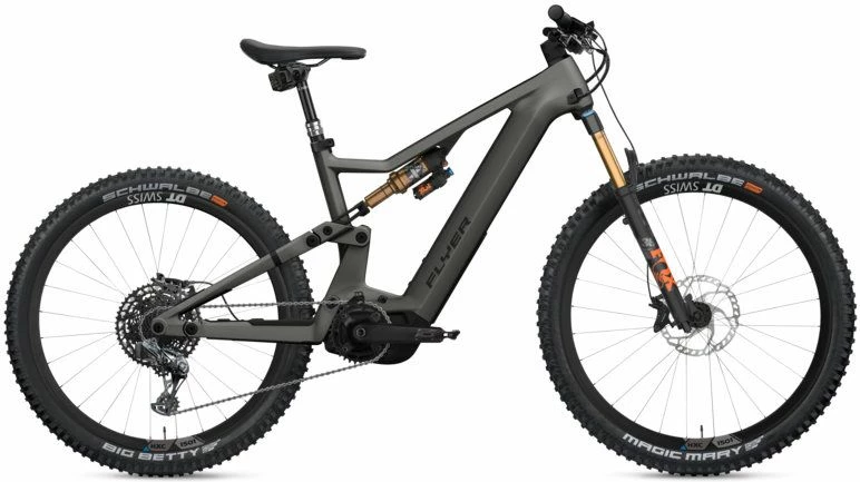 Le Flyer Uproc X 9.50 2022 est un VTT électrique tout-suspendu haute de gamme équipé de la transmission électronique Sram X01AXS. En plus de son cadre carbone, il combine une puissance impressionnante et une grande réserve d’énergie. Grâce au moteur Panasonic GX Ultimate Pro FIT 95 Nm, vous pourrez gravir n’importe quelle montagne, quelque soit le dénivelé. Le plaisir de rouler est garanti par la batterie Flyer FIB 750 Wh. Ses suspensions Fox parfaitement réglées avec débattement de 150 mm, lui permettent de briller aussi bien en descente qu’en montée. Ses roues mixtes – 29 pouces à l’avant, 27,5 pouces à l’arrière – en font un VTT électrique ultra agile.